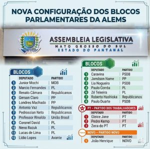 O Diário Oficial da Assembleia Legislativa de Mato Grosso do Sul trouxe na edição da última terça-feira (13) a composição das bancadas e blocos após o término da janela partidária, período de 30 dias em que a legislação eleitoral autoriza os parlamentares a mudarem de partido sem perder o mandato, em ano de eleições gerais. Dos 24 parlamentares, 12 trocaram de legenda, alterando significativamente a composição das bancadas. Dois novos partidos ganharam representação na Casa, o NOVO: com a filiação do deputado João Henrique Catan e o Avante, legenda na qual ingressou o deputado Lídio Lopes.